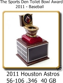 Congratulations to the Houston Astros on winning the prestigious Sports Den Toilet Bowl Award for baseball, for being the worse team in 2011. The Astros finished the 2011 season 56-106 and a whopping 40 games out of firts place.