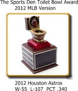 Now that the 2012 MLB season is over it’s time for The Sports Den to hand out it’s prestigious Toilet Bowl Award for the worse team in baseball for the 2012 season. A hearty congratulations go out to the 2012 Houston Astros for finishing last in MLB in 2012. It’s the second year in a row the Astros have won the award, havein finished with a 56-106 record in 2011, the Astros did one better going 55-107 in 2012. Unless a small miracle happens the Astros should be making a run for a three in a row in 2013, only they will be doing it as an American League team.