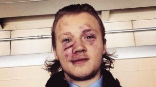 The next time you have a rough day at work consider the rough night Jets prospect Ryan Olsen had at his job. Olsen’s team took on the Portland Pirates on Friday night. Olsen was involved in a fight in the first period, and was hit in the face with a puck in the second. The first picture is what Olsen looked like before the game, and the second picture is what he looked like after. Ouch!